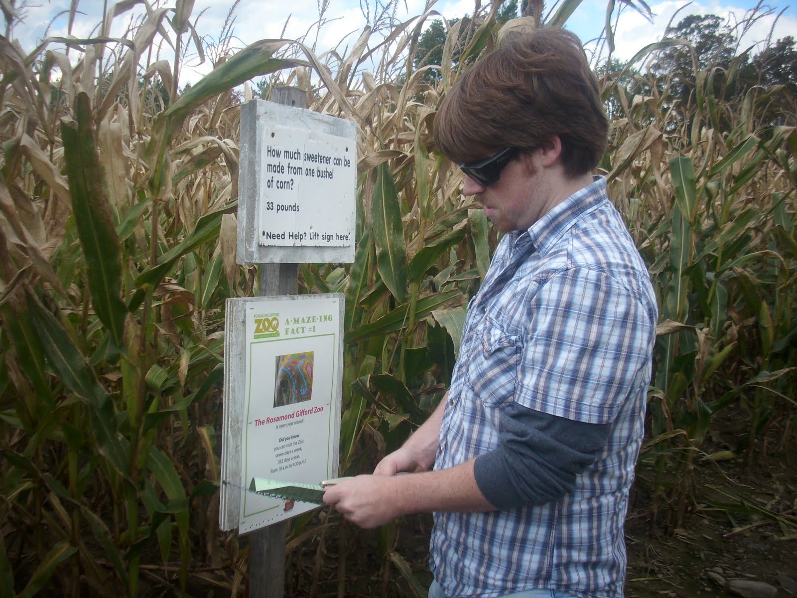 Upon arrival at Critz Farms, the parking attendant hands you a green punch card, with instructions for the corn maze. You are to walk through it and find information booths set up by the Rosamond-Gifford Zoo. At each of these booths is a trivia question about animals, as well as a hole punch with a designated shape. Once you find the booths, you punch your card, and when you award yourself 5 of the 7 punches, you find your way out of the maze, go to the café, and redeem the card for free apple fritters. The promise of free fritters and the desire to live out my Gilmore fantasies (they definitely had a corn maze festival in Stars Hollow) were my motivations for conquering the 10-acre corn maze. James just wanted the apple fritters.