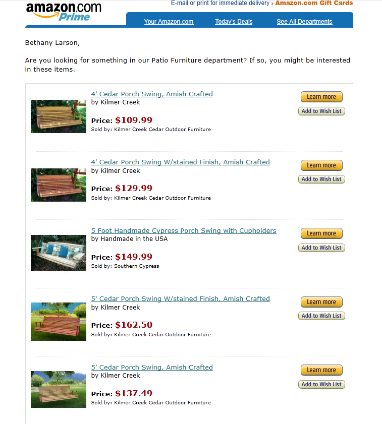 So, here’s the deal: I’m pretty sure I’ve never searched for anything Amish-related on Amazon, and I sure as hell haven’t ever searched for patio furniture. But, here it is anyway! The fun part? If I were in the market for porch swings, I would absolutely want it to Amish-crafted. Which basically means that Amazon straight up knows me. Which is actually really, really creepy.