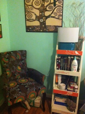 I rearranged furniture a couple weeks ago and set up a nice little book nook for myself in my room. Problem was, I had no lamp over there, and my overhead light SUCKS, so at night it was really hard to read. BUT NO MORE. I now have a cute little blue lamp. 🙂